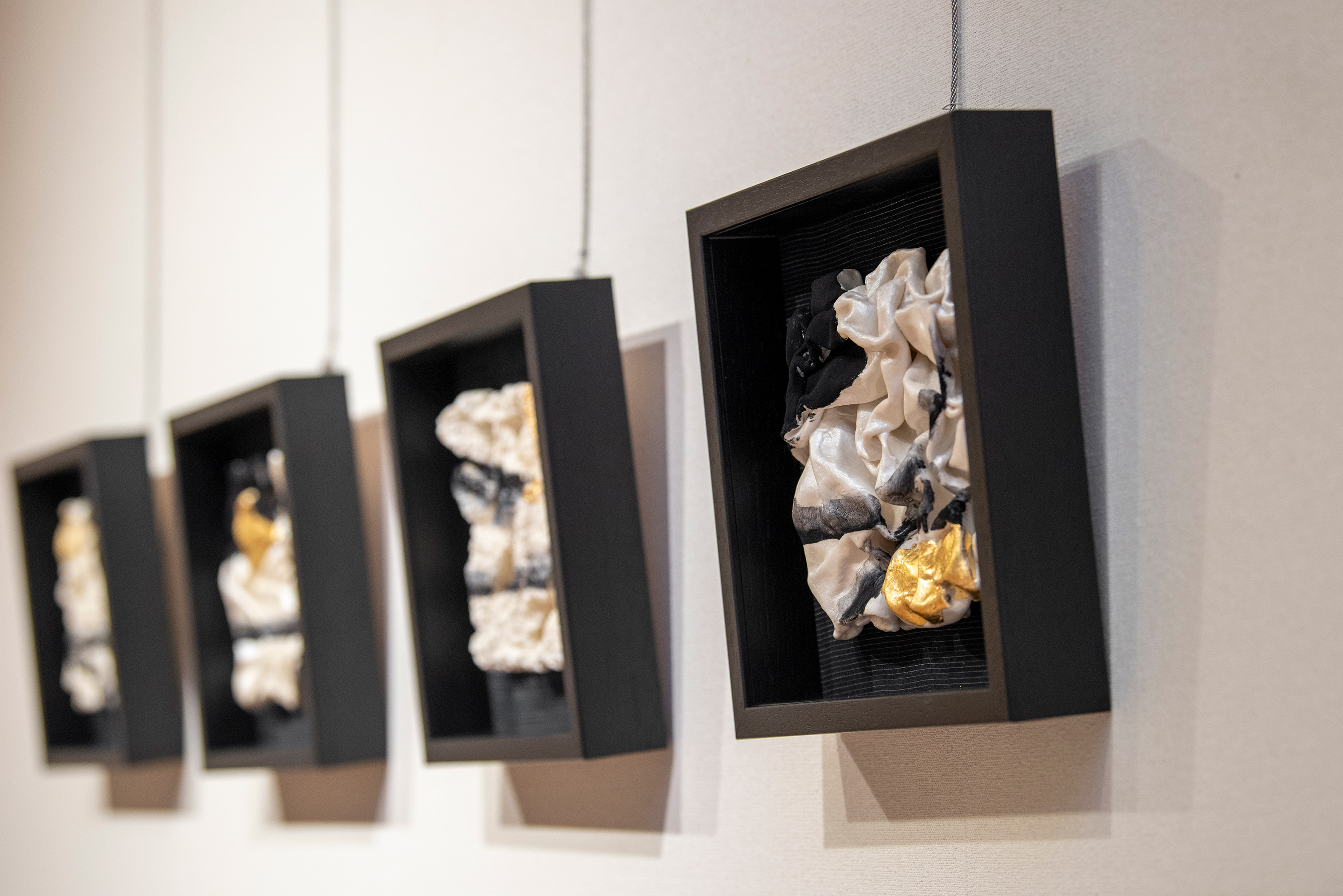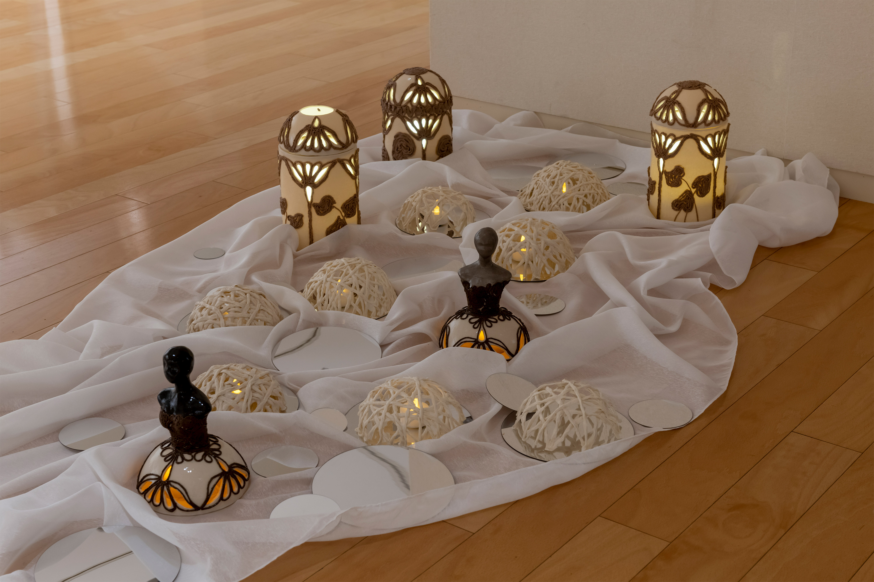 レースドールとは、液状の磁器土を染み込ませた本物の布やレースを1,200度前後の高温焼成で生地を焼失させ、磁器土だけを残す技法で制作される磁器ドールです。繊細かつ優美な質感が魅力です。
